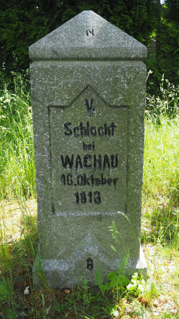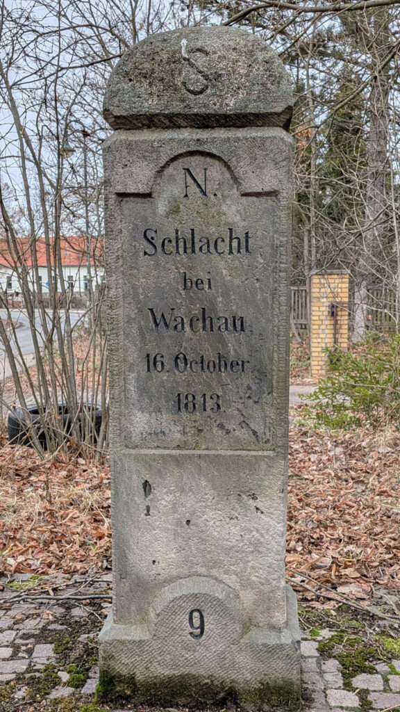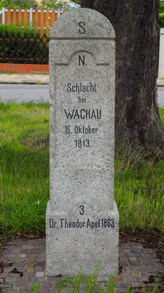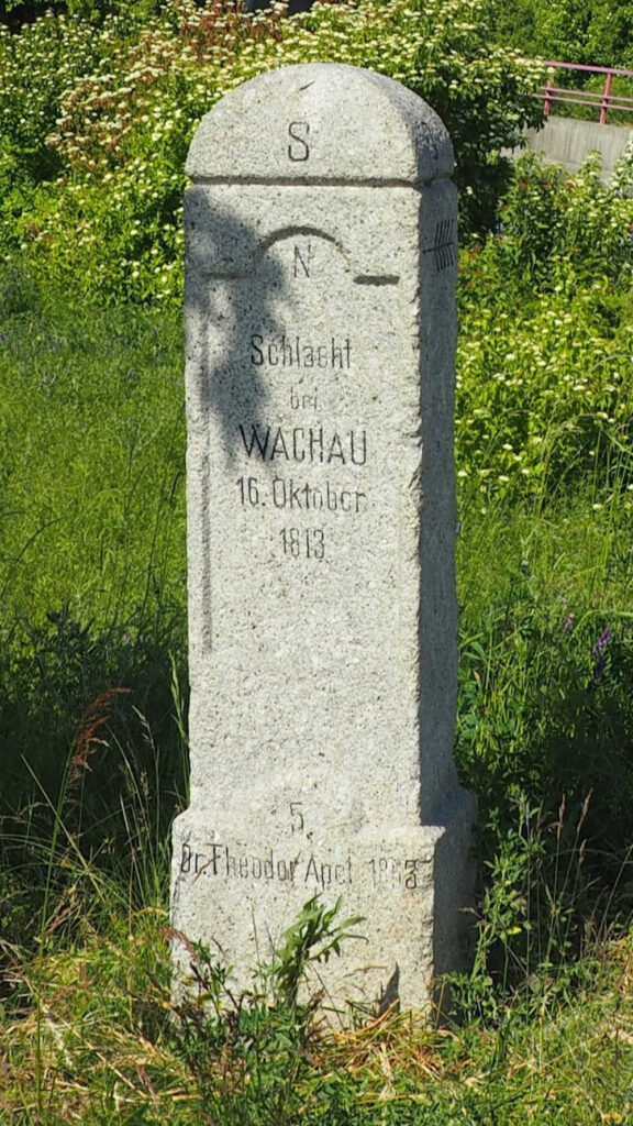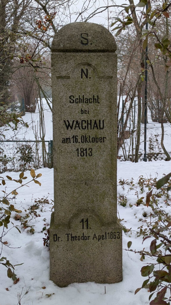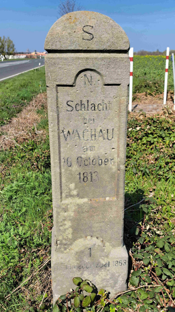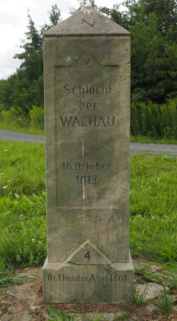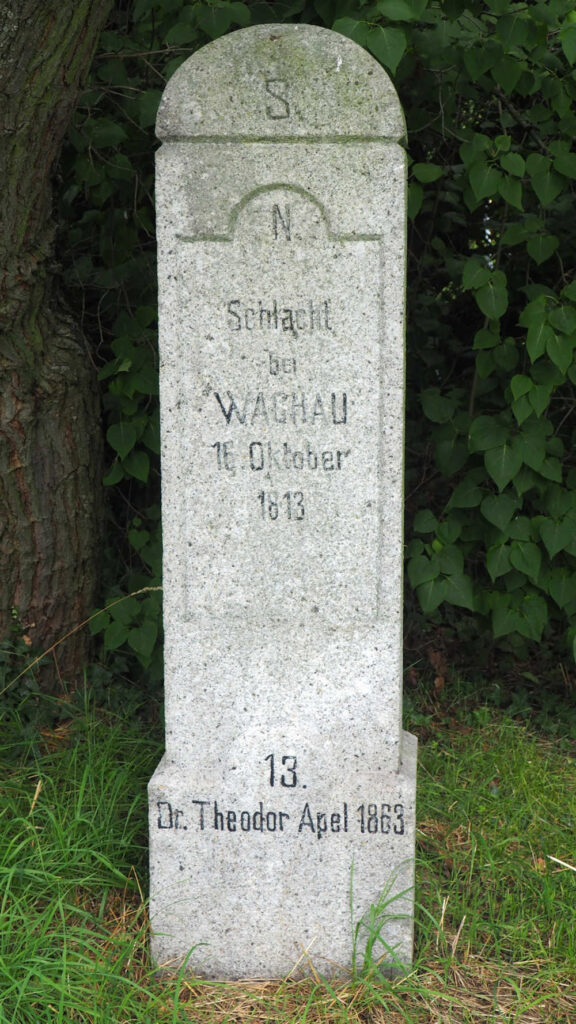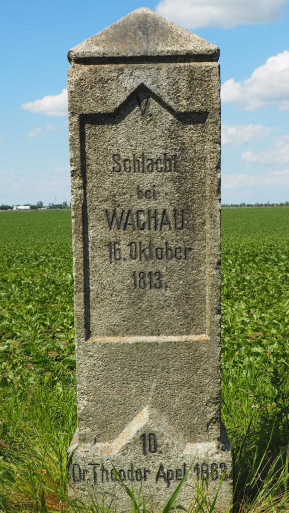 Inschrift zum Schlachtfeld hin: Schlacht bei Wachau, 16. October 1813