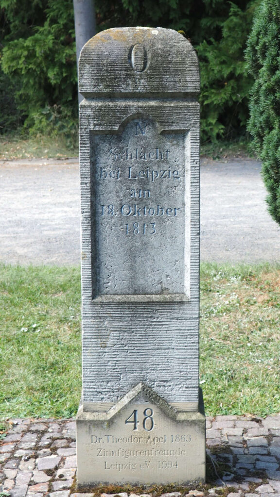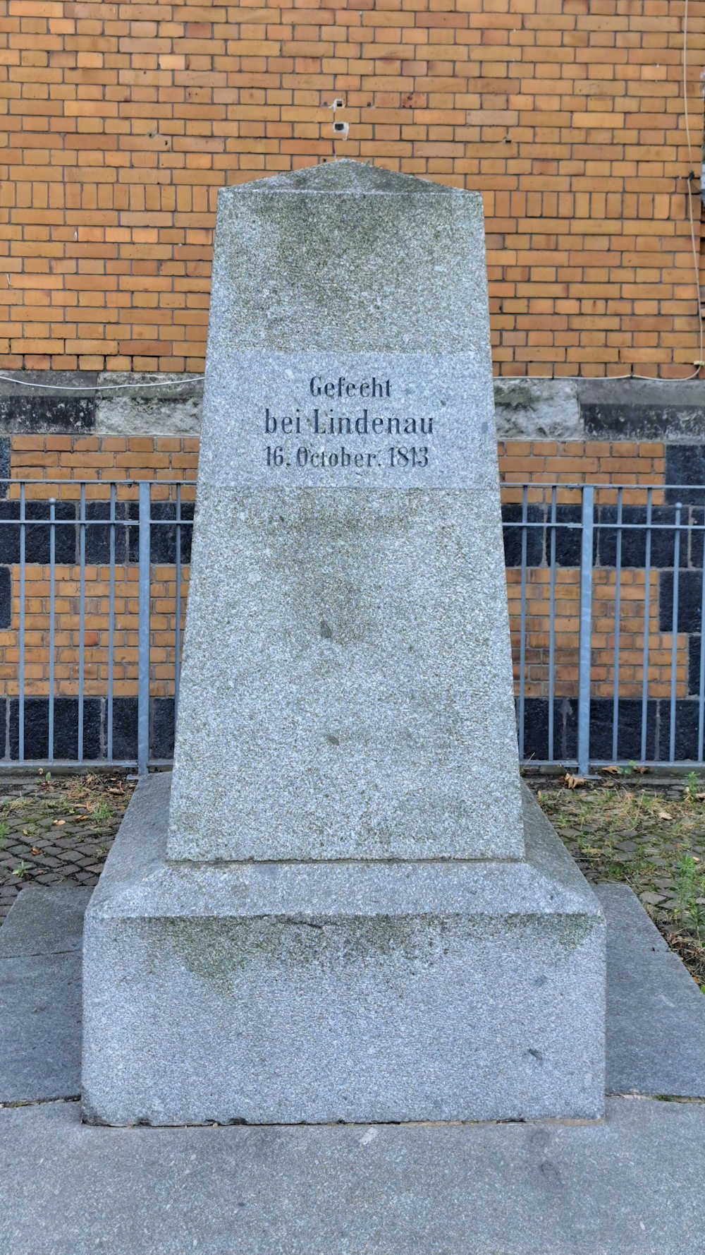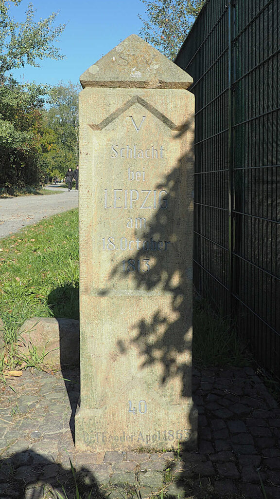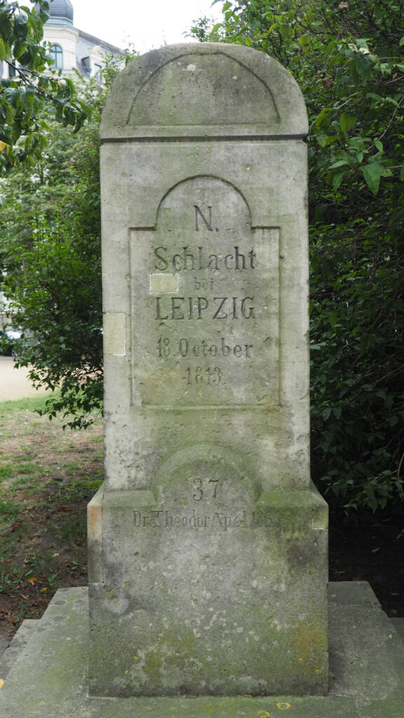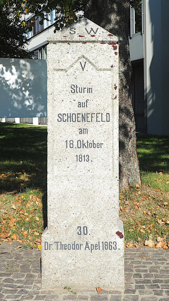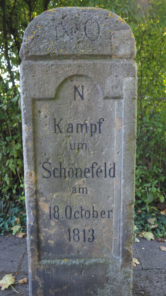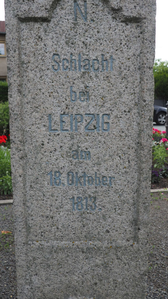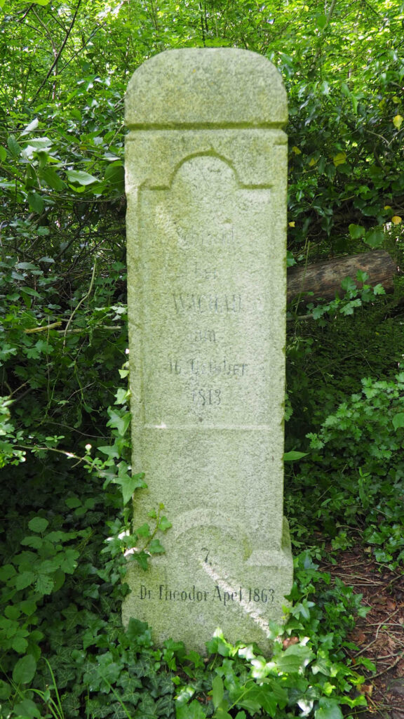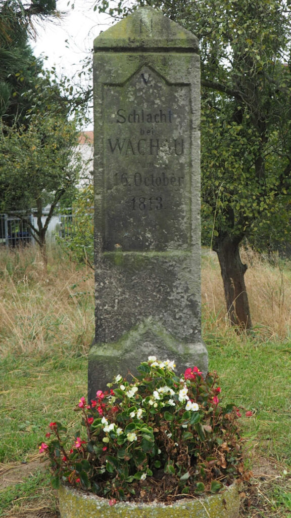 Inschrift zum Schlachtfeld hin: Schlacht bei Wachau, 16. October 1813
