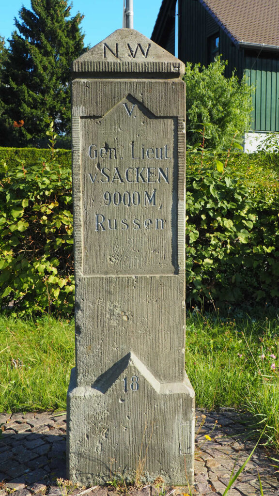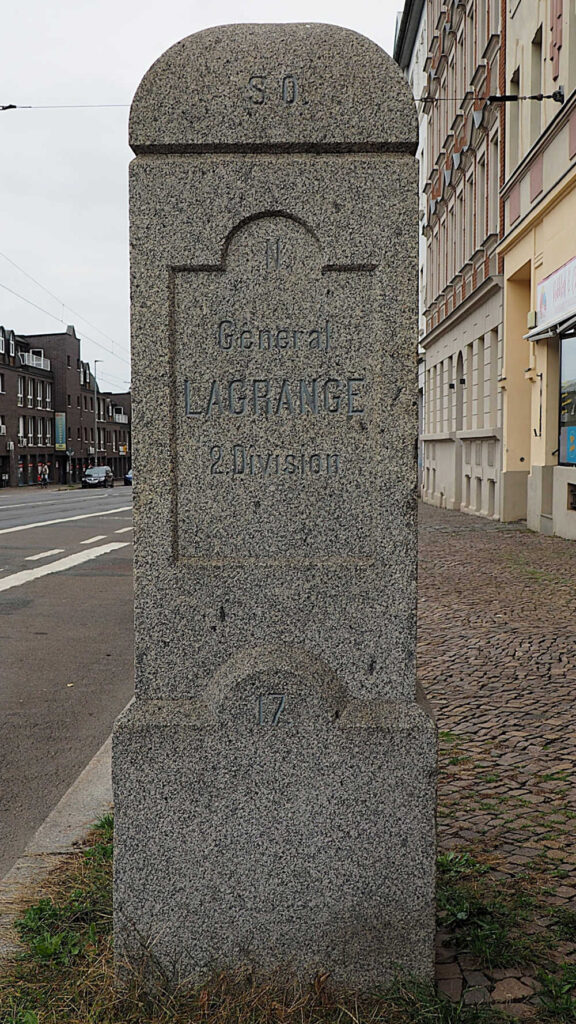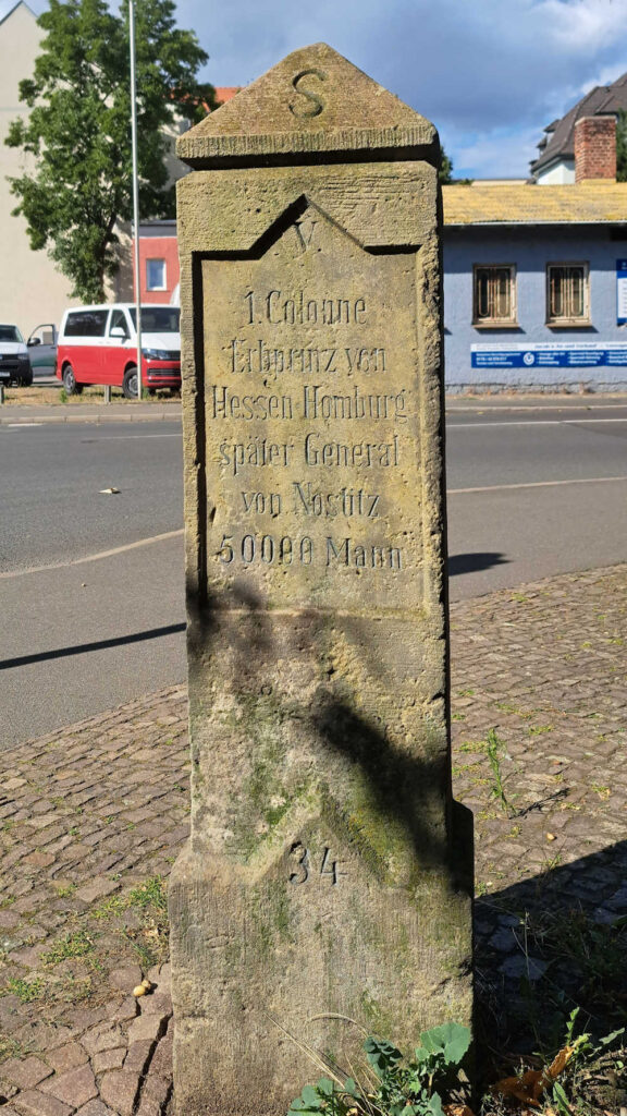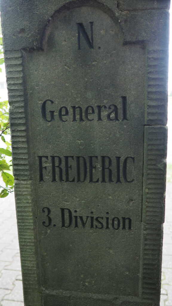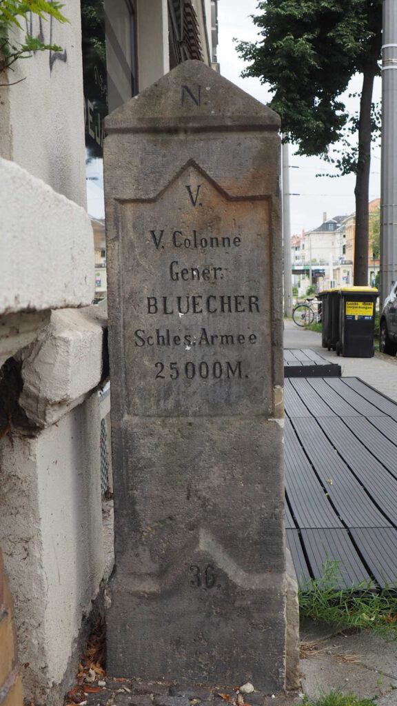 Inschrift vom Schlachtfeld weg: GENERAL V. BLÜCHER SCHLESISCHE ARMEE 60 000 MANN