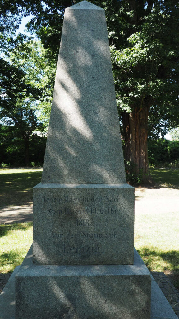Inschrift Westseite (vom See weg): letzte Rast in der Nacht vom 18. zum 19. Octbr. 1813 vor dem Sturm auf Leipzig