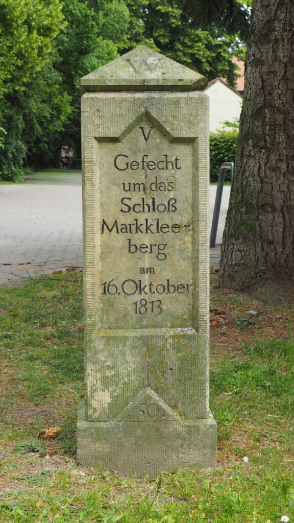 Inschrift zum Schlachtfeld hin: Gefecht um das Schloss Markkleeberg