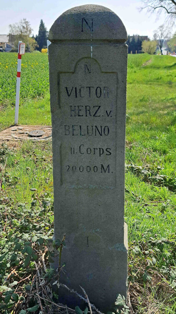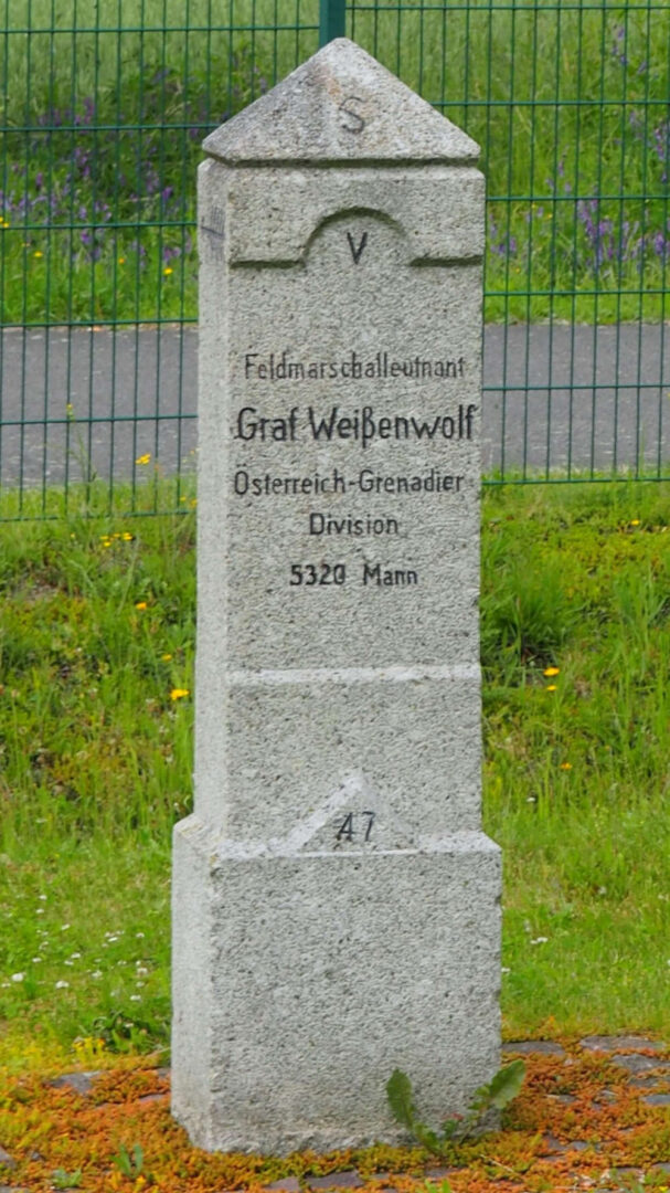 Inschrift vom Schlachtfeld weg: Feldmarschalleutnant Graf Weißenwolf Österreich-Grenadier Division 5320 Mann