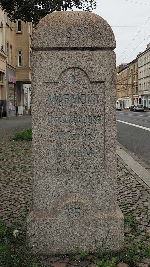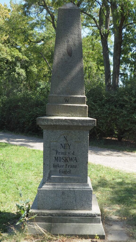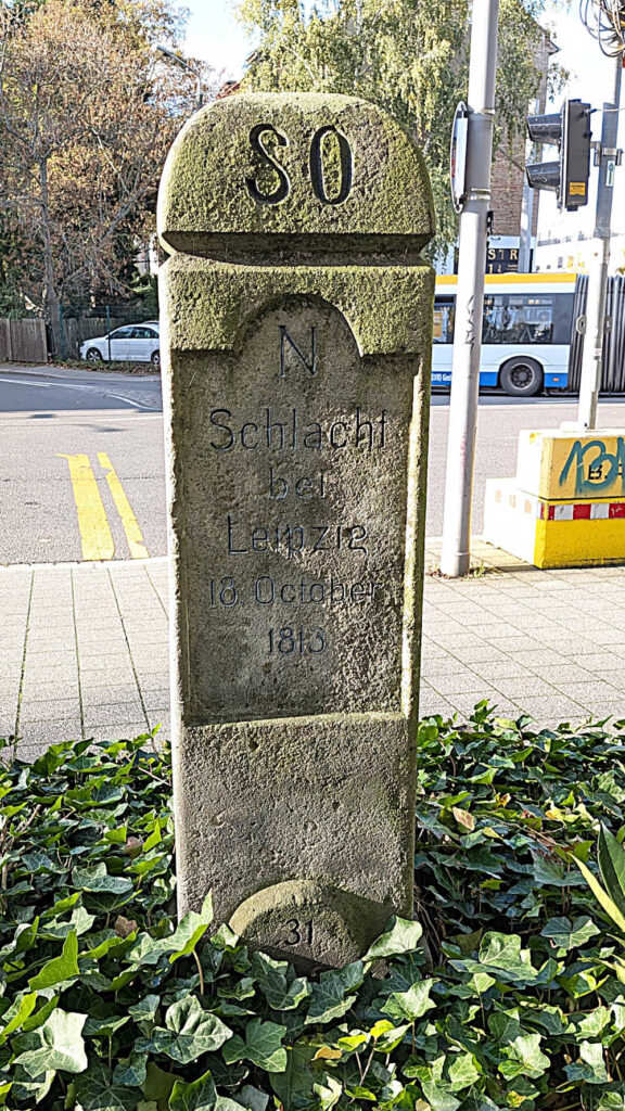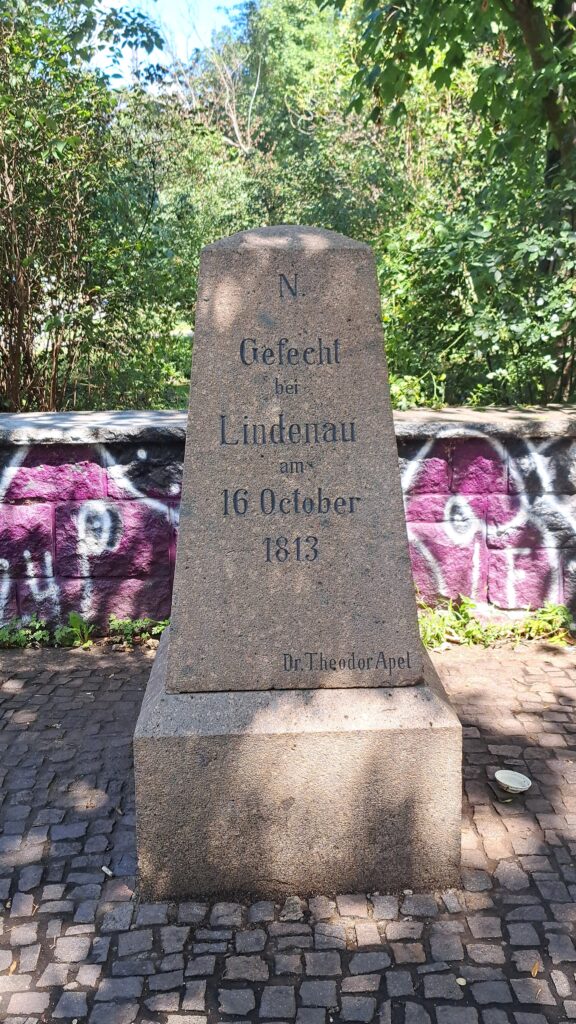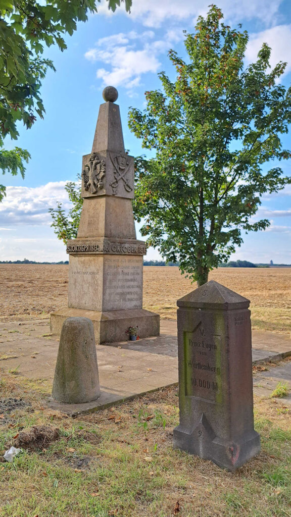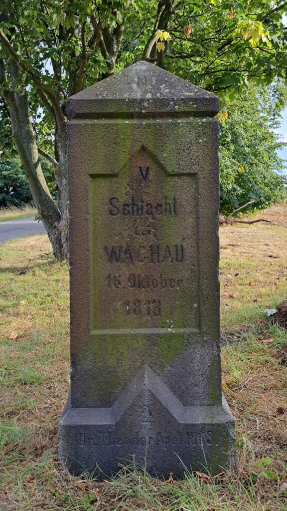 Inschrift zum Schlachtfeld hin: Schlacht bei Wachau, 16. October 1813