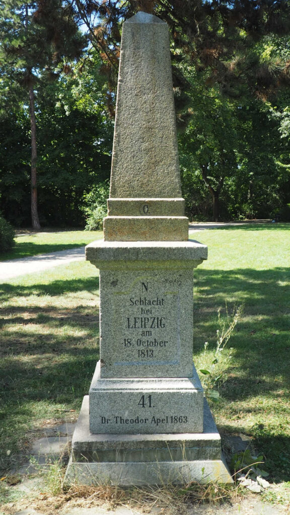 Inschrift zum Schlachtfeld hin: Schlacht bei Wachau 16. October 1813