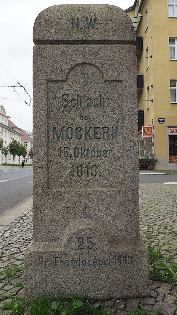Inschrift zum Schlachtfeld hin: GEFECHTSSTAND SCHLACHT BEI MÖCKERN 16. OKTOBER 1813